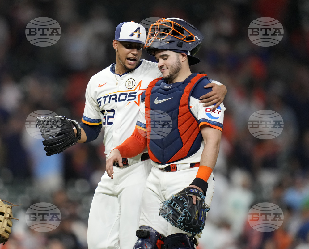 Houston Astros relief pitcher Bryan Abreu, left, and catcher Yainer Diaz, right, celebrate after their win over the Texas Rangers in a baseball game Monday, Sept. 15, 2025, in Houston. (AP Photo/Karen Warren)
