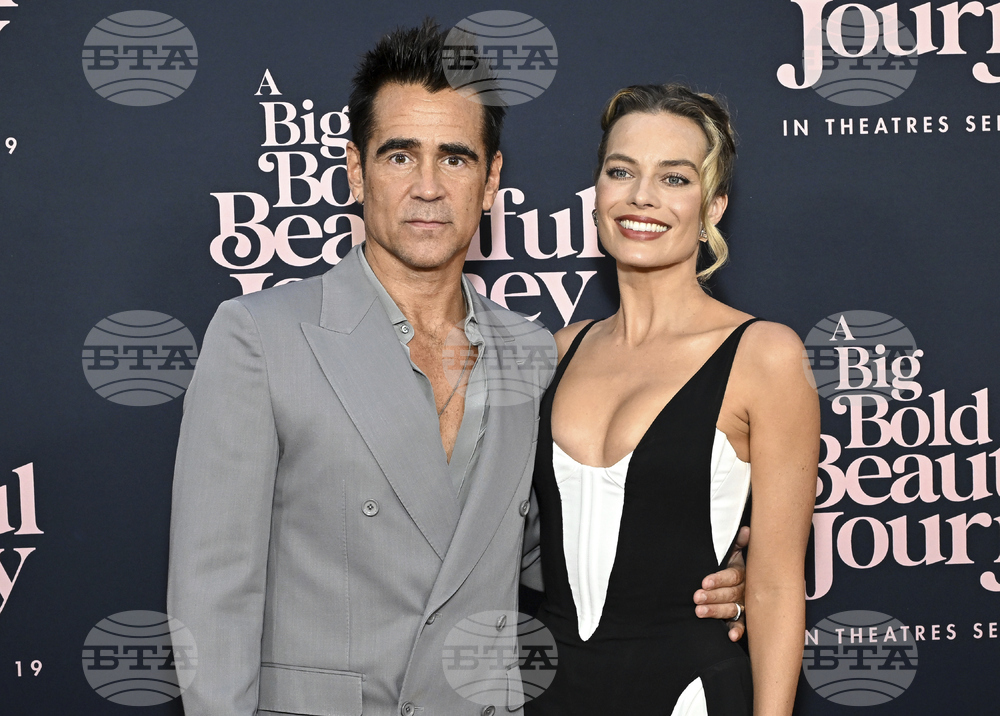 Colin Farrell, left, and Margot Robbie attend the Sony Pictures premiere of "A Big Bold Beautiful Journey" at AMC Lincoln Square on Monday, Sept. 15, 2025, in New York. (Photo by Evan Agostini/Invision/AP)