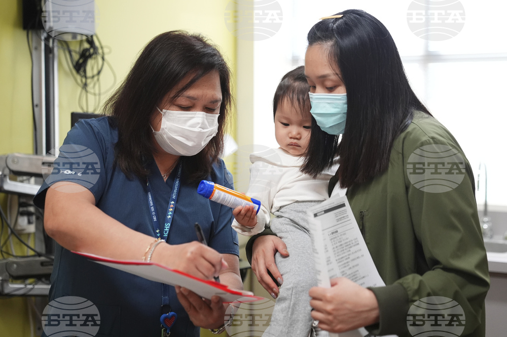 Mother Huanyu Zhen distracts her daughter Lena Kuang, 1, as lead medical assistant Maria Teresa Diocales prepares to administer another vaccine at International Community Health Services, Wednesday, Sept. 10, 2025, in Seattle. (AP Photo/Lindsey Wasson)
