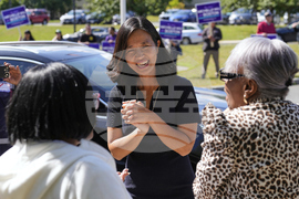 FILE - Boston Mayor Michelle Wu chats with voters at a polling place, Tuesday, Sept. 9, 2025, in the Dorchester neighborhood of Boston. (AP Photo/Charles Krupa, File)