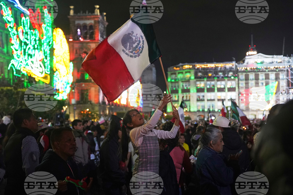 President Claudia Sheinbaum rings the bell as she gives the annual independence shout from the balcony of the National Palace to kick off Independence Day celebrations at the Zocalo, Mexico City's main square, Monday, Sept. 15, 2025. (AP Photo/Eduardo Verdugo)