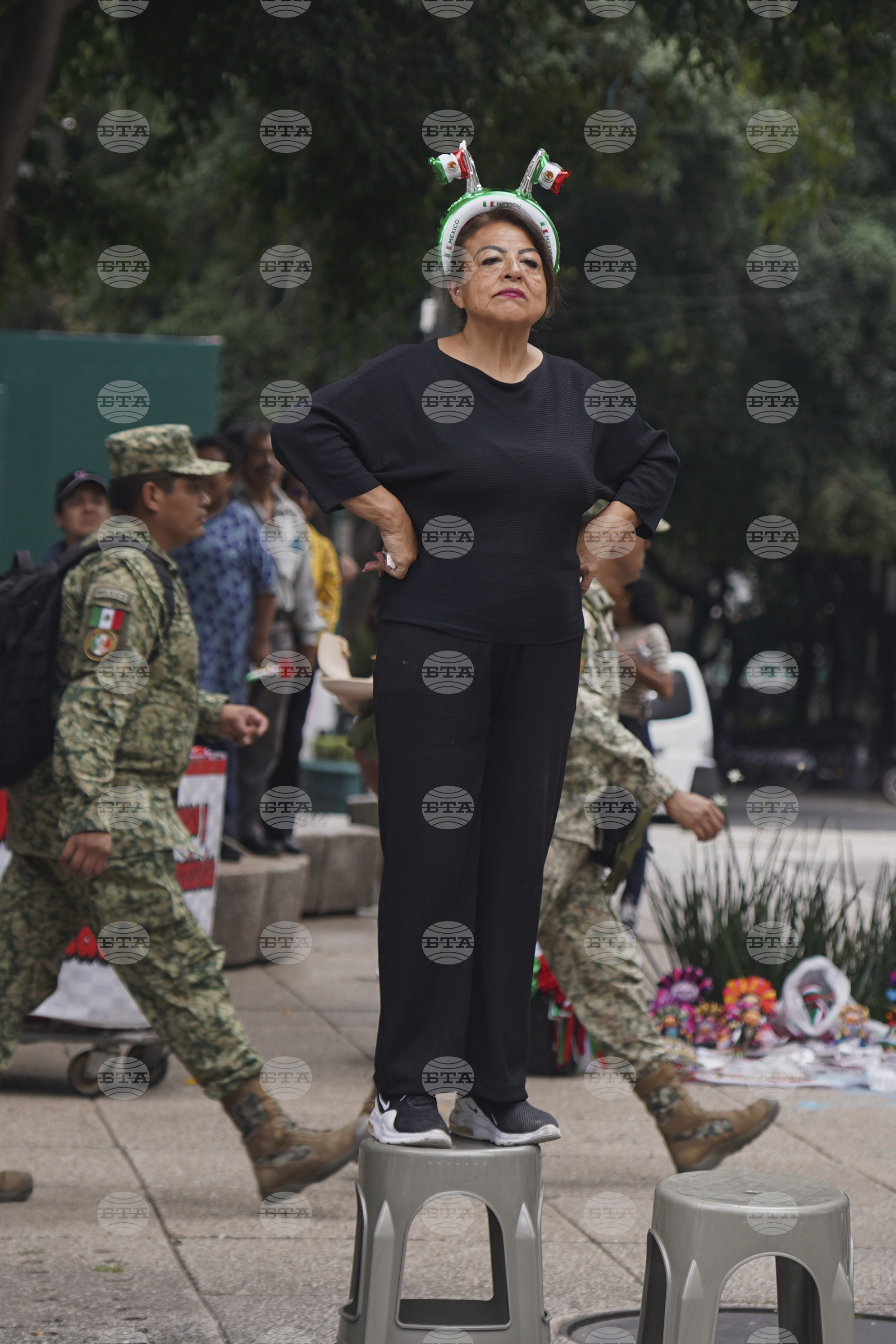 A woman stands on a stool to get a better view of the Independence Day military parade marching past on Reforma Ave. in Mexico City, Tuesday, Sept. 16, 2025. (AP Photo/Jon Orbach)