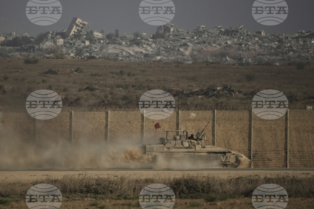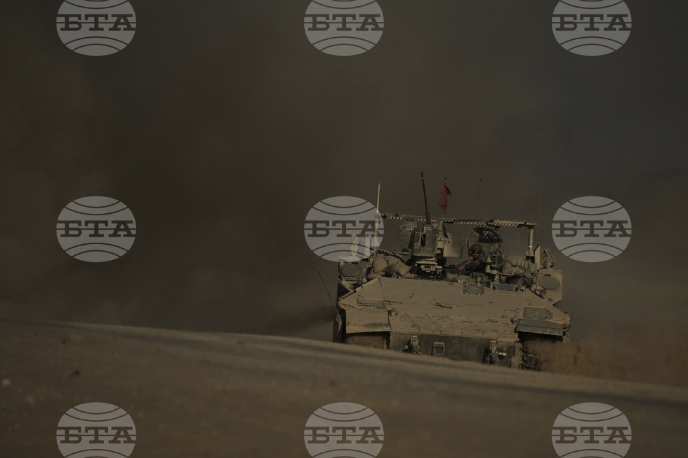 An Israeli armored vehicle moves along the Israeli-Gaza border as seen from southern Israel, Tuesday, Sept. 16, 2025. (AP Photo/Leo Correa)