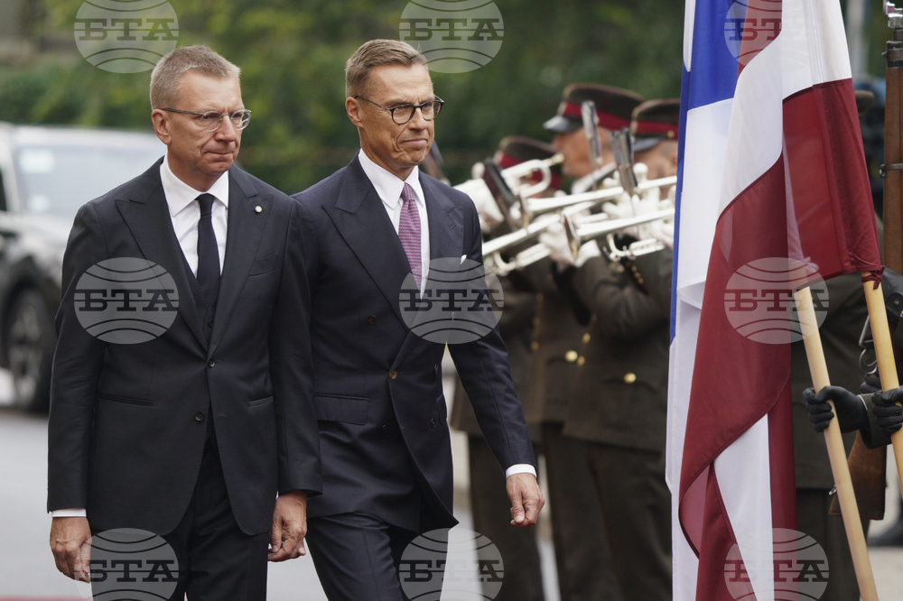 Latvia's President Edgars Rinkevics, left, and Finland's President Alexander Stubb attend an official welcoming ceremony at the Riga Castle in Riga, Latvia, Tuesday, Sept. 16, 2025. (AP Photo/Roman Koksarov)