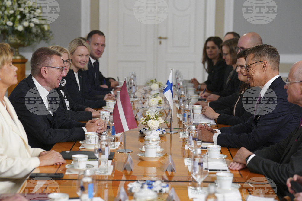 Finland's President Alexander Stubb, second right, and Latvia's President Edgars Rinkevics, second left, attend the talks at the Riga Castle in Riga, Latvia, Tuesday, Sept. 16, 2025. (AP Photo/Roman Koksarov)