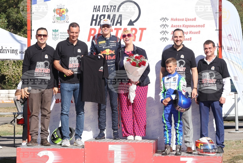 София (16 септември 2025) Кампанията за пътна безопасност: „На пътя няма restart“ се открива на картинг пистата „Красна поляна“. Инициативата има за цел да повиши вниманието върху опасностите от шофирането с превишена скорост, особено сред младите хора. Чрез посланието „На пътя няма restart" се напомня, че за разлика от игрите и симулаторите, в реалния живот последствията от едно неправилно решение на пътя са необратими. На снимката: състезателят от Формула 3 Никола Цолов (вляво) и рали състезателят Димитър Илиев (в средата).