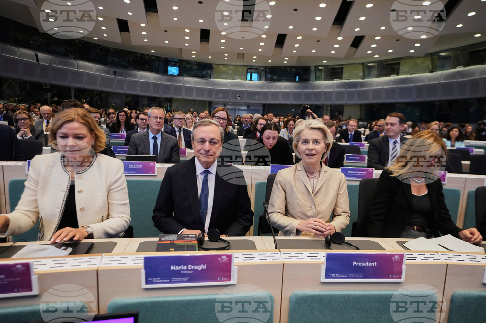 European Commission President Ursula von der Leyen, center right, and author Mario Draghi, center left, pose prior to addressing the conference "One Year After the Draghi Report" at the EU Charlemagne building in Brussels, Tuesday, Sept. 16, 2025. (AP Photo/Virginia Mayo)