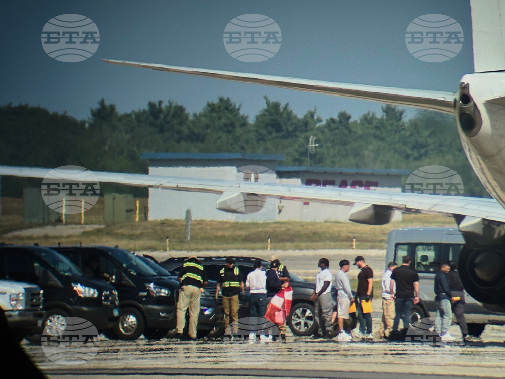 In this photo obtained by the Associated Press, ICE detainees line up to board a flight at Portsmouth International Airport at Pease, N.H., on Saturday, Aug. 16, 2025. (AP Photo)