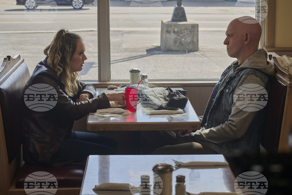 This image released by Republic Pictures shows Billie Lourd, left, and Anthony Carrigan in a scene from "Adulthood." (Albert Camicioli/Republic Pictures via AP)