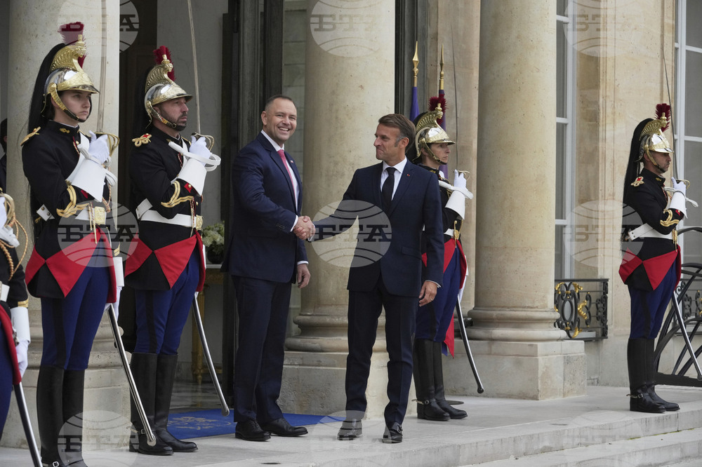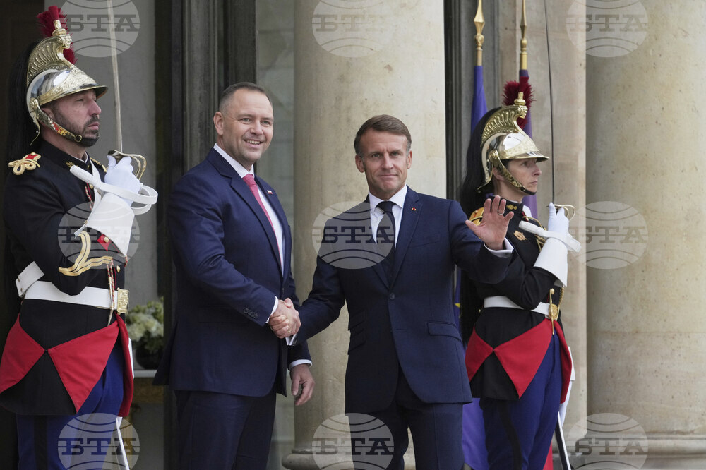 French President Emmanuel Macron, left, welcomes Poland's President Karol Nawrocki before a meeting at the Elysee Palace, in Paris, France, Tuesday, Sept. 16, 2025. (AP Photo/Thibault Camus)