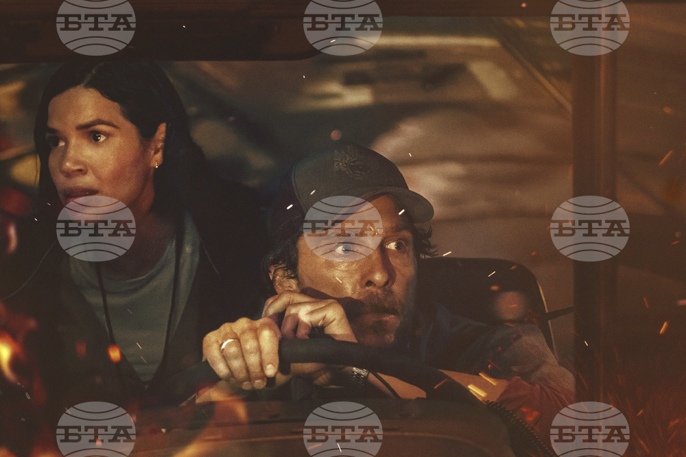 This image released by Apple TV+ shows America Ferrara, left, and Matthew McConaughey in a scene from "The Lost Bus." (Apple TV+ via AP)