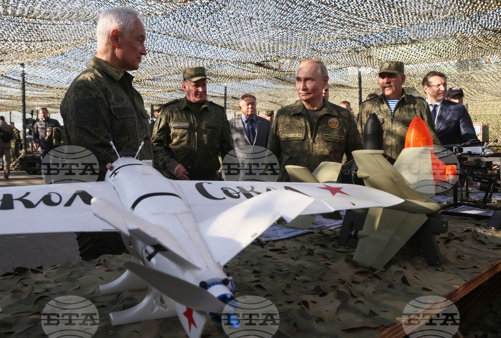Russian President Vladimir Putin, accompanied by Russian Defence Minister Andrei Belousov, left, and Commander-in-Chief of the Russian Ground Forces Andrey Mordvichev, 2nd left, inspects Russian weapons and equipment during his visit to the Russian-Belarusian joint military drills "Zapad 2025" (West 2025) at the Mulino training ground in Nizhny Novgorod region, Russia, Tuesday, Sept. 16, 2025. (Mikhail Metzel/Sputnik, Kremlin Pool Photo via AP)