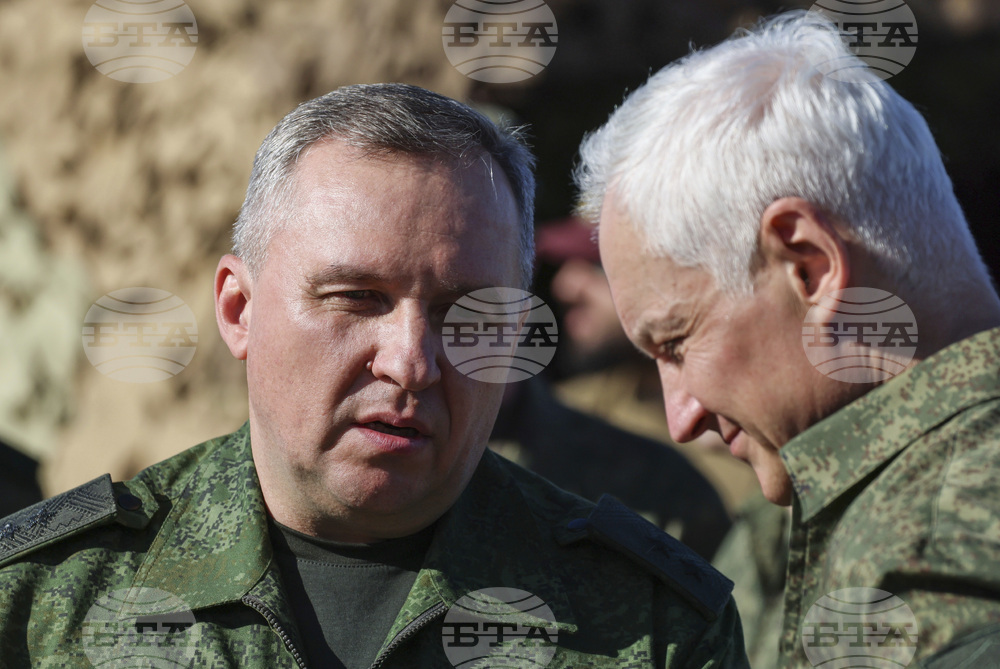 Russian Defense Minister Andrei Belousov, right, and Belarusian Defense Minister Viktor Khrenin talk to each other during the Russian-Belarusian joint military drills "Zapad 2025" (West 2025) at a command post at the Mulino training ground in Nizhny Novgorod region, Russia, Tuesday, Sept. 16, 2025. (Mikhail Metzel/Sputnik, Kremlin Pool Photo via AP)