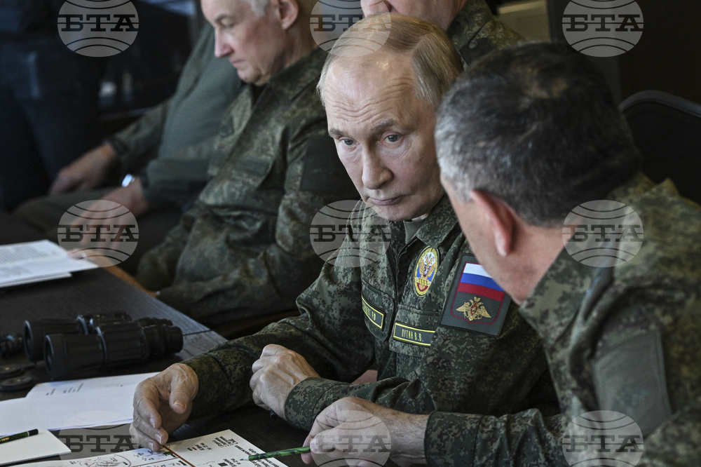 CORRECTS SOURCE FOR POOL - Russian President Vladimir Putin observes the Russian-Belarusian joint military drills "Zapad 2025" (West 2025) at a command post at the Mulino training ground in Nizhny Novgorod region, Russia, Tuesday, Sept. 16, 2025. (Sergey Bobylev/Sputnik, Kremlin Pool Photo via AP)