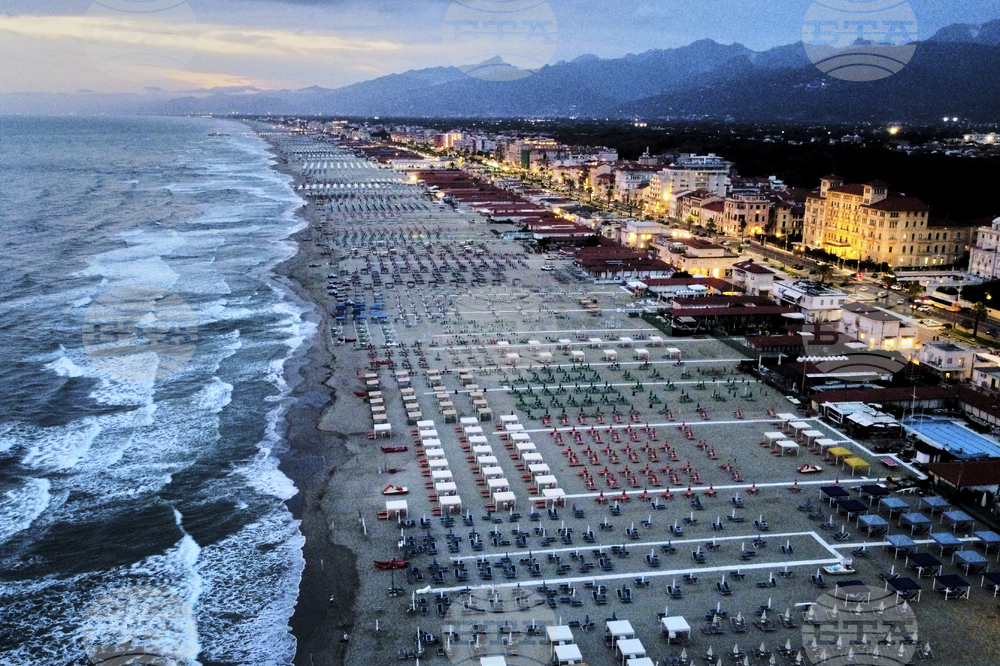 The large beach is almost empty after vacations' season in Italy ended last weekend, Viareggio, Italy, Tuesday, Sept.16, 2025. (AP Photo/Michael Probst)