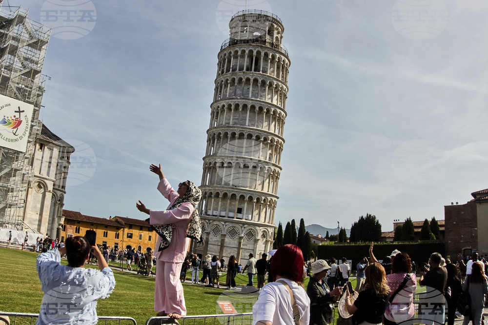 Tourists pose in front of the Leaning Tower of Pisa, Italy, Wednesday, Sept. 17, 2025. (AP Photo/Michael Probst)