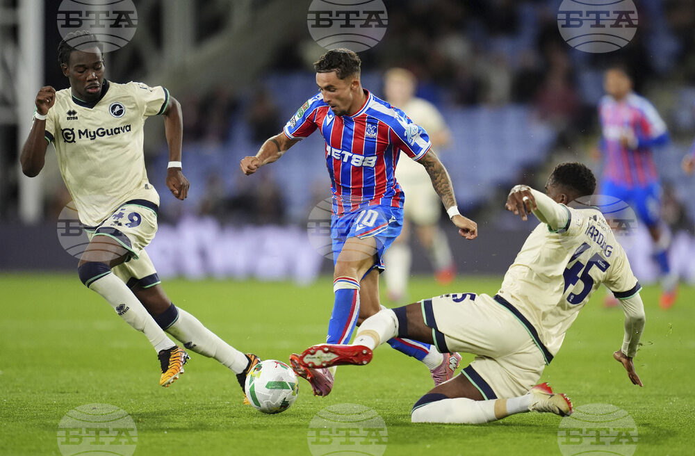 Crystal Palace's Yeremi Pino, center, is tackled by Millwall's Wes Harding (45) during an English League Cup third round soccer match, Tuesday Sept. 16, 2025, at Selhurst Park in London. (Adam Davy/PA via AP)