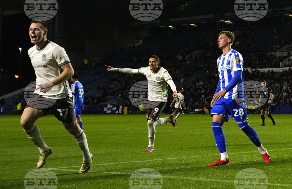 Grimsby's Jaze Kabia, center, celebrates scoring their side's first goal of the game against Sheffield Wednesday during a English League Cup third round soccer match, Tuesday, Sept. 16, 2025, at Hillsborough in Sheffield, England. (Nick Potts/PA via AP)