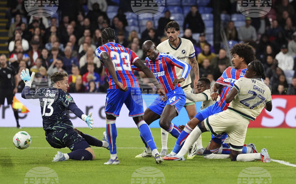 Crystal Palace's Chris Richards, second from right, scoring their side's first goal of the game against Milwall during an English League Cup third round soccer match, Tuesday Sept. 16, 2025, at Selhurst Park in London. (Adam Davy/PA via AP)