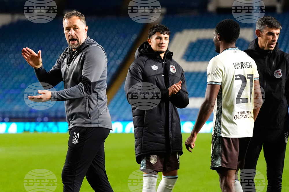 Grimsby fans celebrate their side's first goal of the game against Sheffield Wednesday during a English League Cup third round soccer match, Tuesday, Sept. 16, 2025, at Hillsborough in Sheffield, England. (Nick Potts/PA via AP)