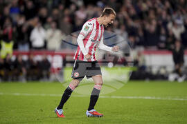 Brentford's Mikkel Damsgaard celebrates scoring the winning penalty against Aston Villa during a English League Cup third round soccer match, Tuesday, Sept. 16, 2025, at the Gtech Community Stadium in London. (Bradley Collyer/PA via AP)