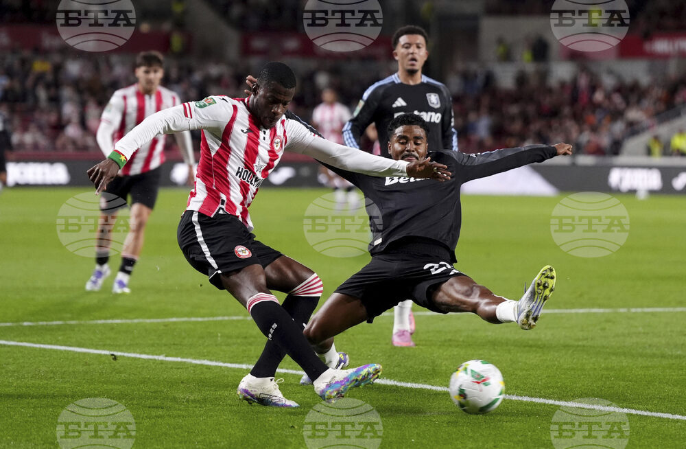 Brentford's Dango Ouattara, left, crosses the ball under pressure from Aston Villa's Ian Maatsen during a English League Cup third round soccer match, Tuesday, Sept. 16, 2025, at the Gtech Community Stadium in London. (Bradley Collyer/PA via AP)