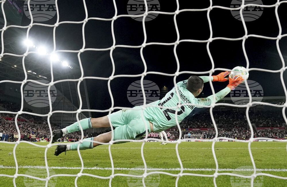 Brentford players celebrate winning a penalty shootout against Aston Villa during a English League Cup third round soccer match, Tuesday, Sept. 16, 2025, at the Gtech Community Stadium in London. (Bradley Collyer/PA via AP)