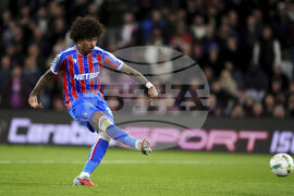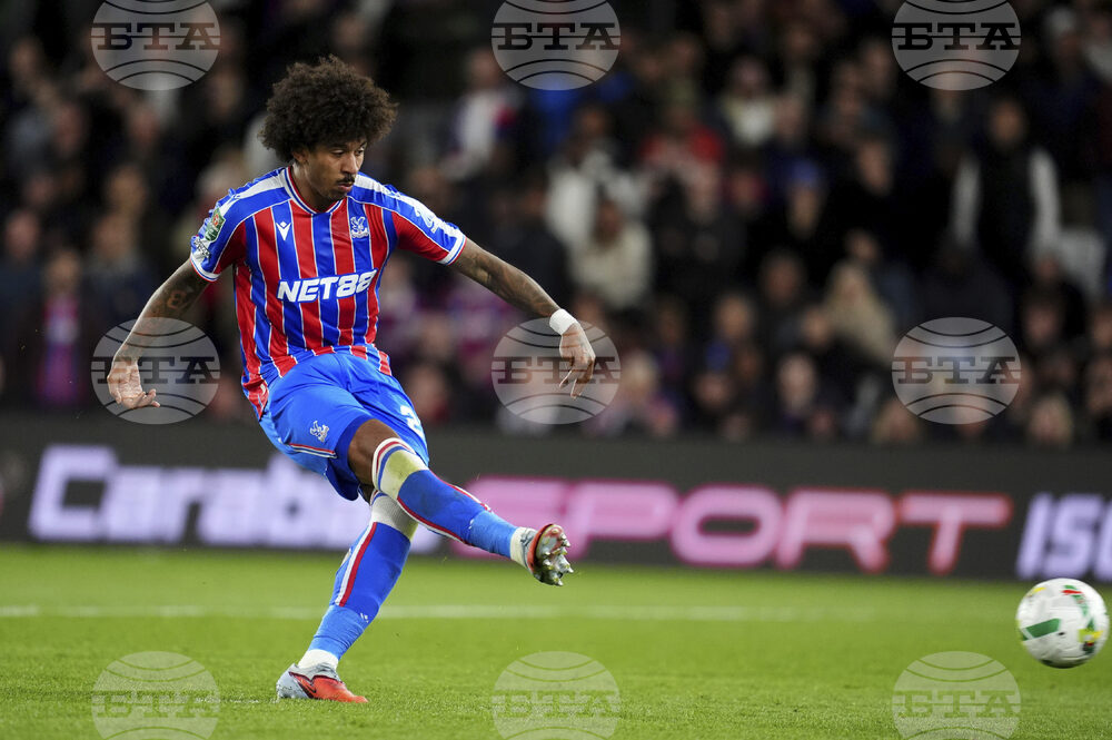 Crystal Palace's Chris Richards scores during the penalty shootout against Milwall during an English League Cup third round soccer match, Tuesday Sept. 16, 2025, at Selhurst Park in London. (Adam Davy/PA via AP)