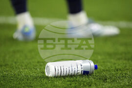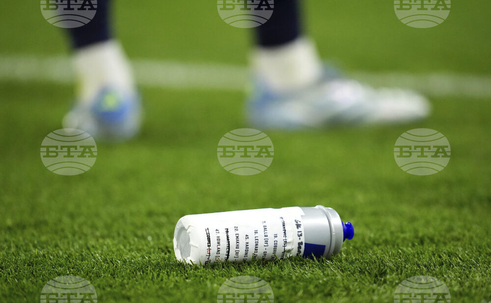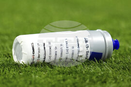 The water bottle of Crystal Palace goalkeeper Walter Benitez with the names of Millwall players written on it rests on the field during a penalty shootout during an English League Cup third round soccer match, Tuesday Sept. 16, 2025, at Selhurst Park in London. (Adam Davy/PA via AP)
