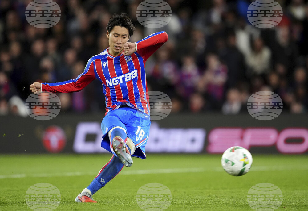 Crystal Palace's Daichi Kamada scores during the penalty shootout against Milwall during an English League Cup third round soccer match, Tuesday Sept. 16, 2025, at Selhurst Park in London. (Adam Davy/PA via AP)