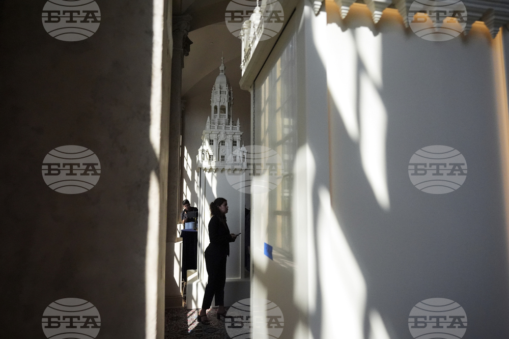 People stand alongside replicas of the Freedom Tower during an event celebrating a new museum honoring the history of Cuban exiles, inside the tower where Cuban refugees were once welcomed to the U.S., Tuesday, Sept. 16, 2025, in downtown Miami. (AP Photo/Rebecca Blackwell)