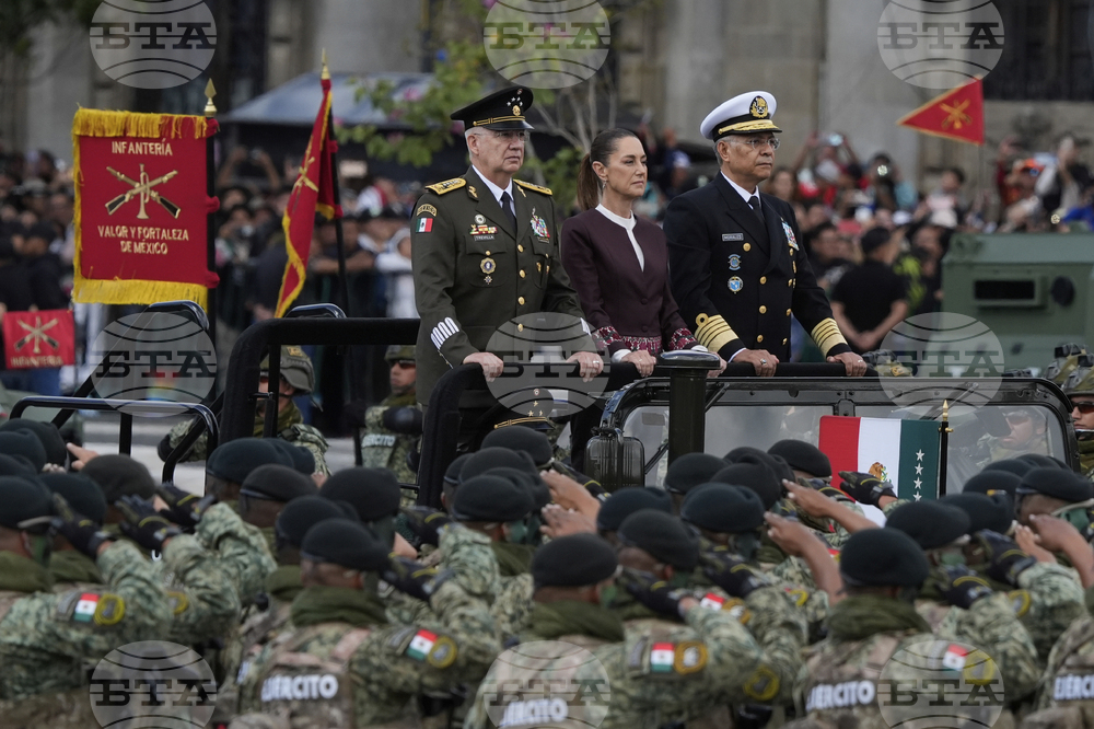 President Claudia Sheinbaum rides through the annual Independence Day military parade, in Mexico City, Tuesday, Sept. 16, 2025. (AP Photo/Fernando Llano)