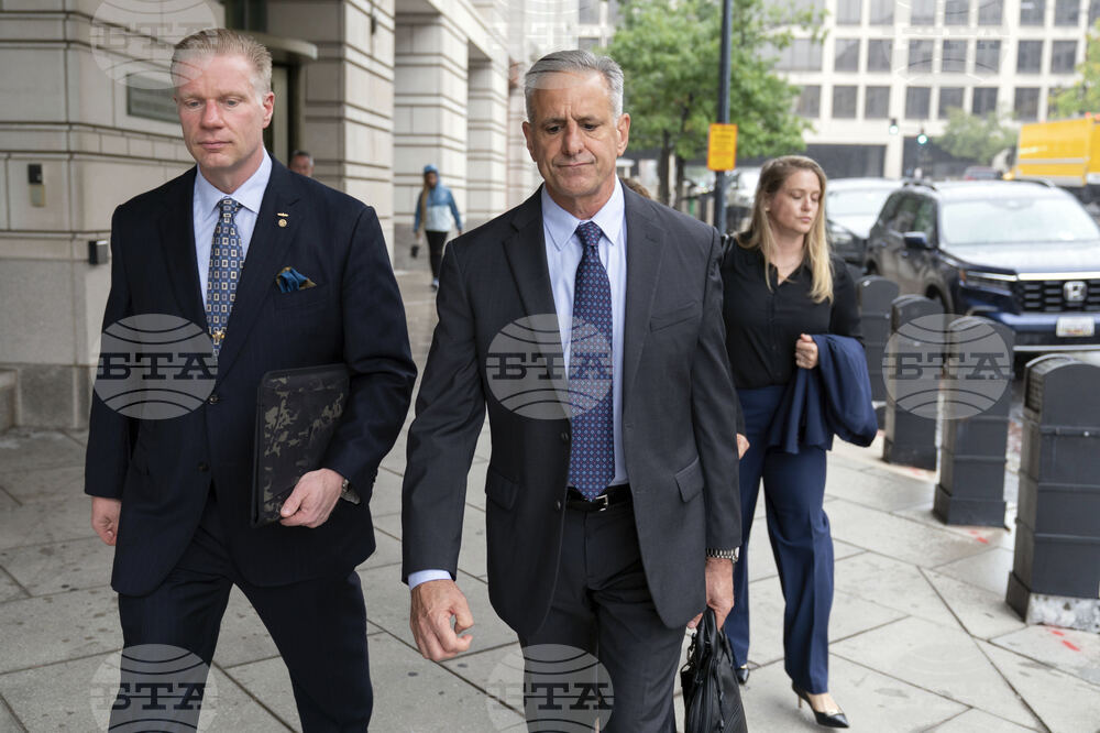 Retired Adm. Robert P. Burke, 63, walks out of the federal courthouse after being sentenced to six years in prison for his conviction on corruption charges, Tuesday, Sept. 16, 2025, in Washington. (AP Photo/Jose Luis Magana)