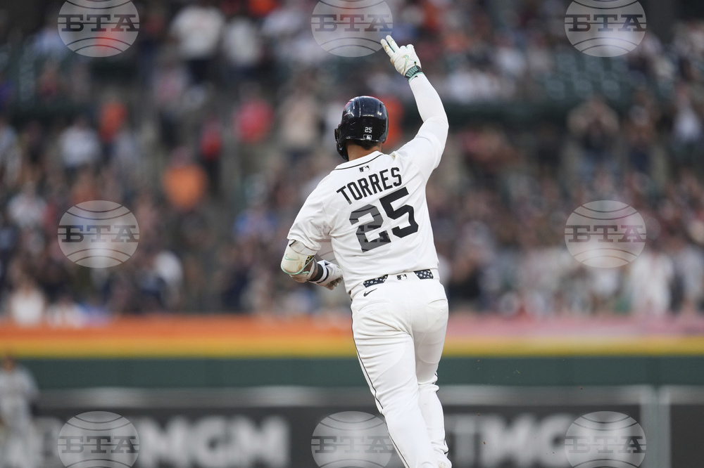 Detroit Tigers' Gleyber Torres reacts to his home run against the Cleveland Guardians during the third inning of a baseball game Tuesday, Sept. 16, 2025, in Detroit. (AP Photo/Paul Sancya)