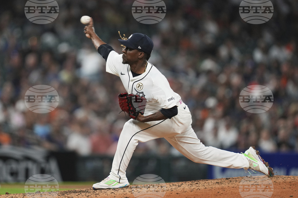 Detroit Tigers pitcher Rafael Montero throws against the Cleveland Guardians during the eighth inning of a baseball game Tuesday, Sept. 16, 2025, in Detroit. (AP Photo/Paul Sancya)