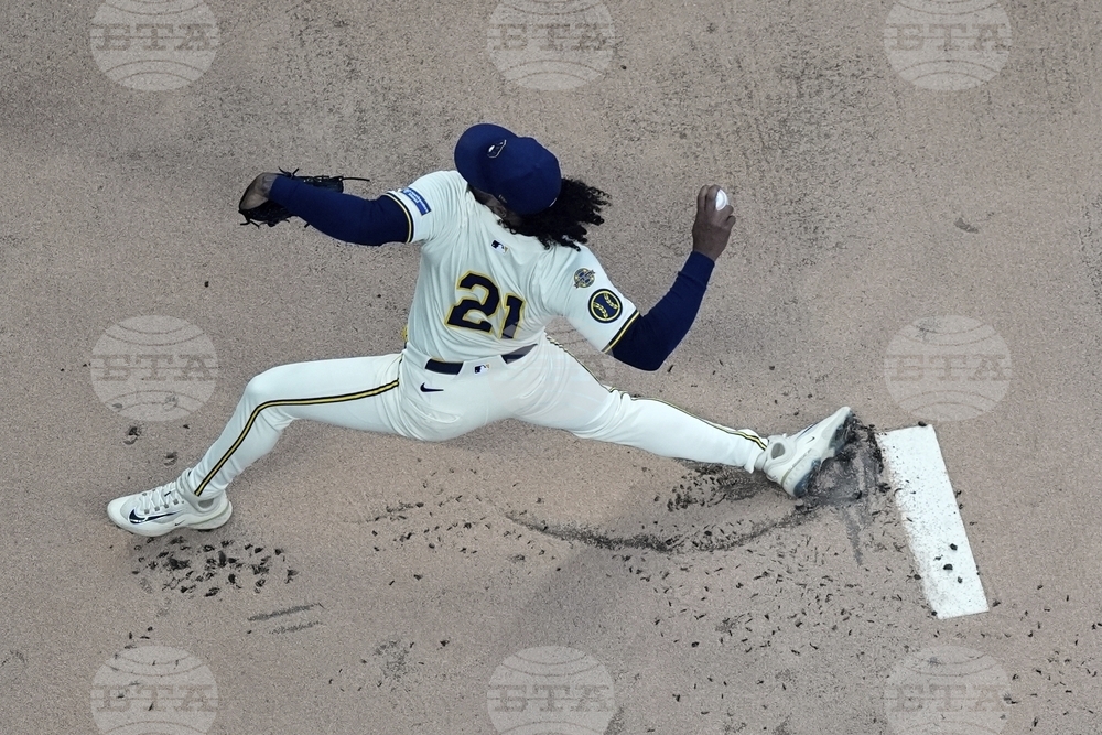 Milwaukee Brewers' Freddy Peralta throws during the first inning of a baseball game against the Los Angeles Angels Tuesday, Sept. 16, 2025, in Milwaukee. (AP Photo/Morry Gash)