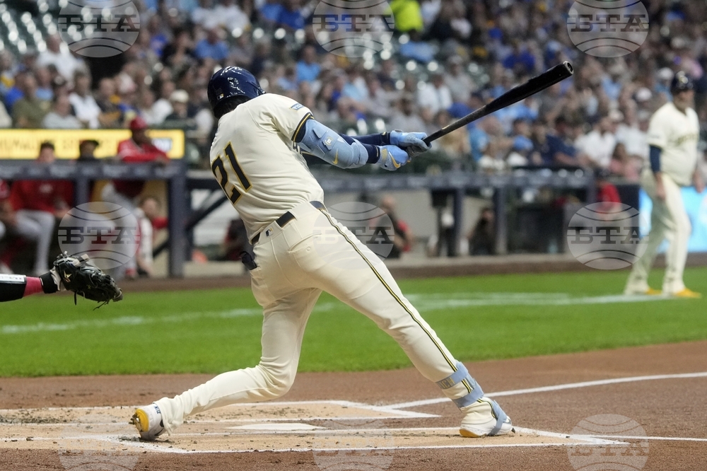 Milwaukee Brewers' Christian Yelich hits an RBI double during the first inning of a baseball game against the Los Angeles Angels Tuesday, Sept. 16, 2025, in Milwaukee. (AP Photo/Morry Gash)