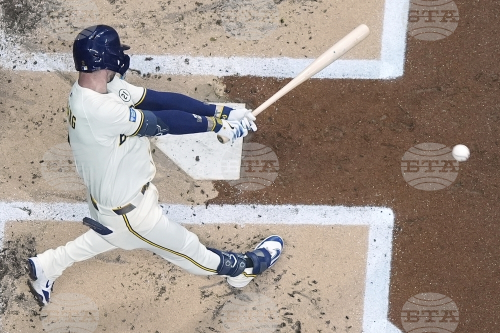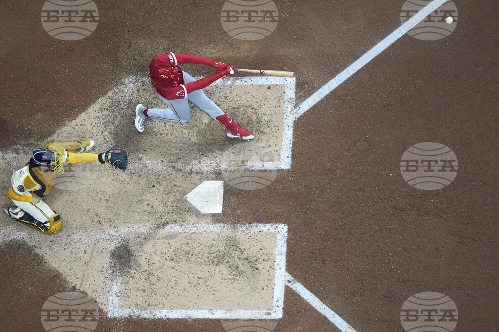 Milwaukee Brewers' Andrew Vaughn hits an RBI double during the seventh inning of a baseball game against the Los Angeles Angels Tuesday, Sept. 16, 2025, in Milwaukee. (AP Photo/Morry Gash)