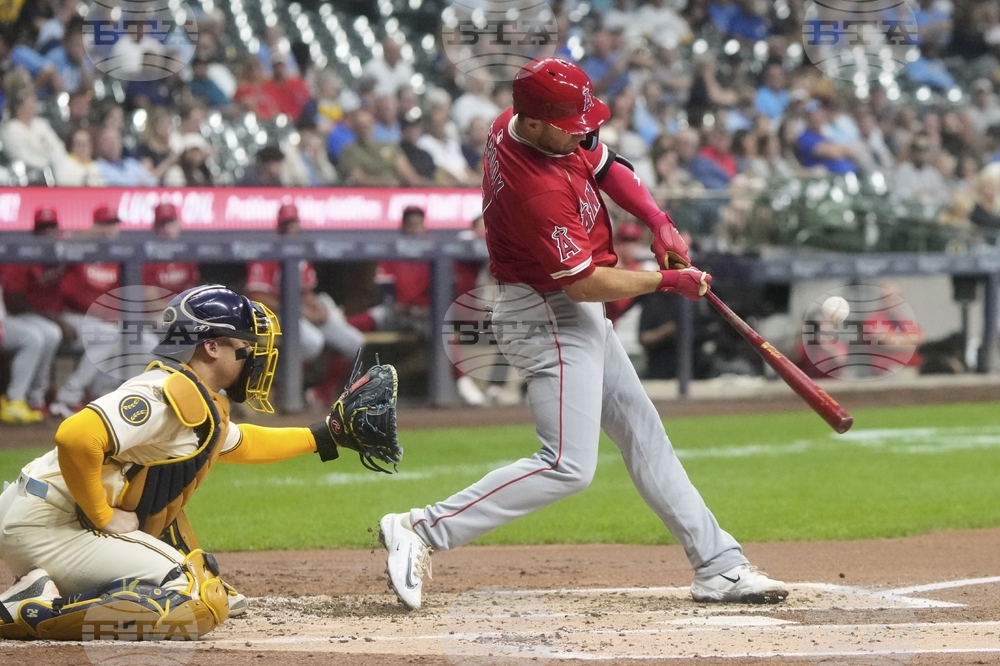 Los Angeles Angels Carter Kieboom hits a single during the second inning of a baseball game against the Milwaukee Brewers Tuesday, Sept. 16, 2025, in Milwaukee. (AP Photo/Morry Gash)