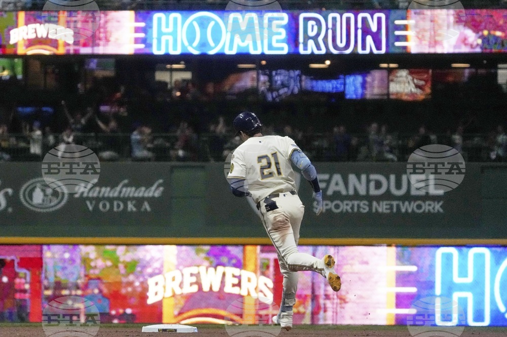 Milwaukee Brewers' Christian Yelich is rounds the bases after hitting a two-run home run during the fourth inning of a baseball game against the Los Angeles Angels Tuesday, Sept. 16, 2025, in Milwaukee. (AP Photo/Morry Gash)