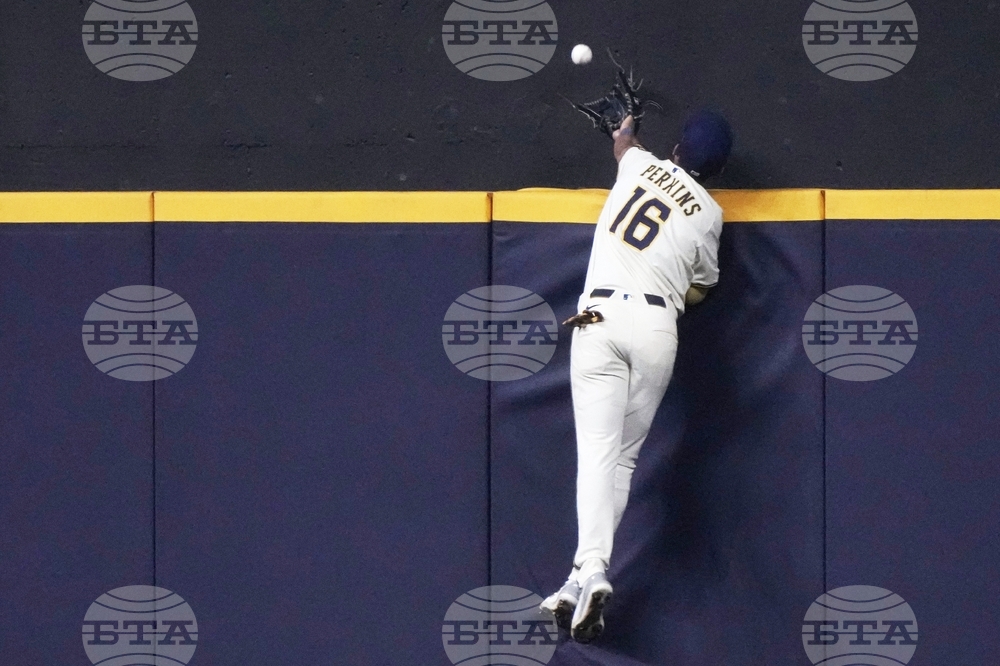Milwaukee Brewers' Blake Perkins can't catch a home run hit by Los Angeles Angels' Denzer Guzman during the fifth inning of a baseball game Tuesday, Sept. 16, 2025, in Milwaukee. (AP Photo/Morry Gash)