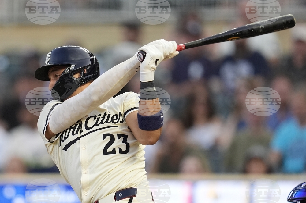 Minnesota Twins third baseman Royce Lewis (23) hits an RBI-single in the first inning of a baseball game against the Minnesota Twins, Tuesday, Sept. 16, 2025, in Minneapolis. (AP Photo/Mike Stewart)