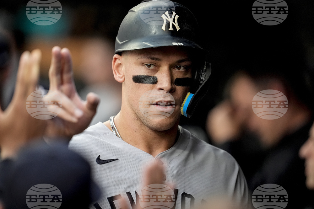 New York Yankees outfielder Aaron Judge (99) stands in the dugout in the first inning of a baseball game against the Minnesota Twins, Tuesday, Sept. 16, 2025, in Minneapolis. (AP Photo/Mike Stewart)