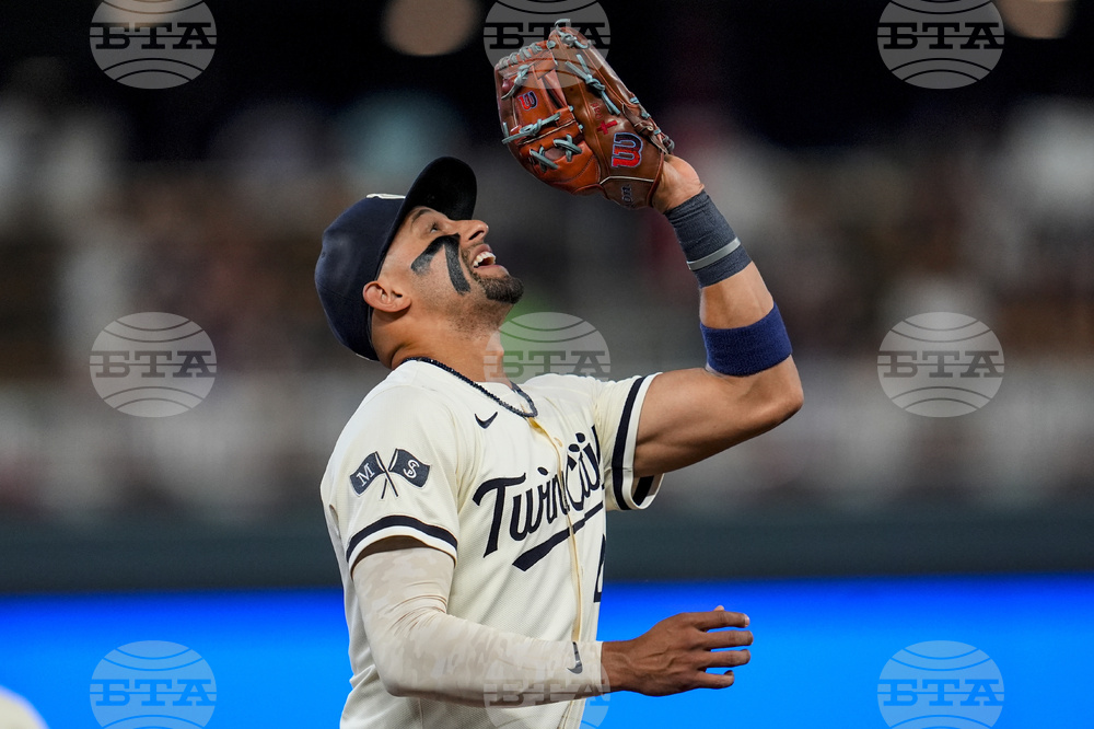 Minnesota Twins outfielder Austin Martin (16) fields a ball hit by New York Yankees' Ryan McMahon in the fourth inning of a baseball game, Tuesday, Sept. 16, 2025, in Minneapolis. (AP Photo/Mike Stewart)