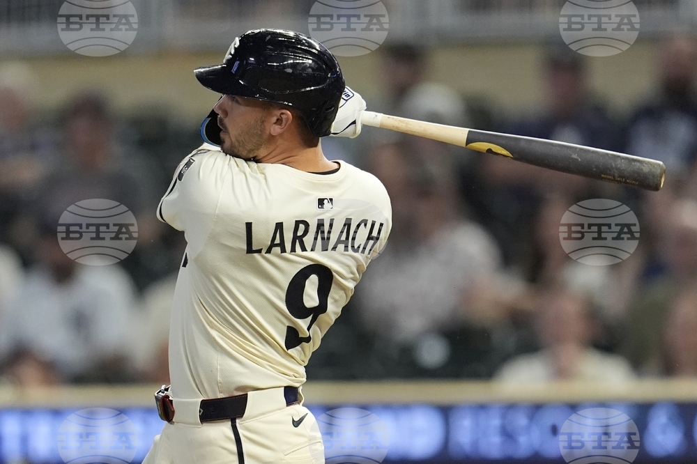 Minnesota Twins' Trevor Larnach (9) hits a solo home run against the New York Yankees in the ninth inning of a baseball game, Tuesday, Sept. 16, 2025, in Minneapolis. (AP Photo/Mike Stewart)