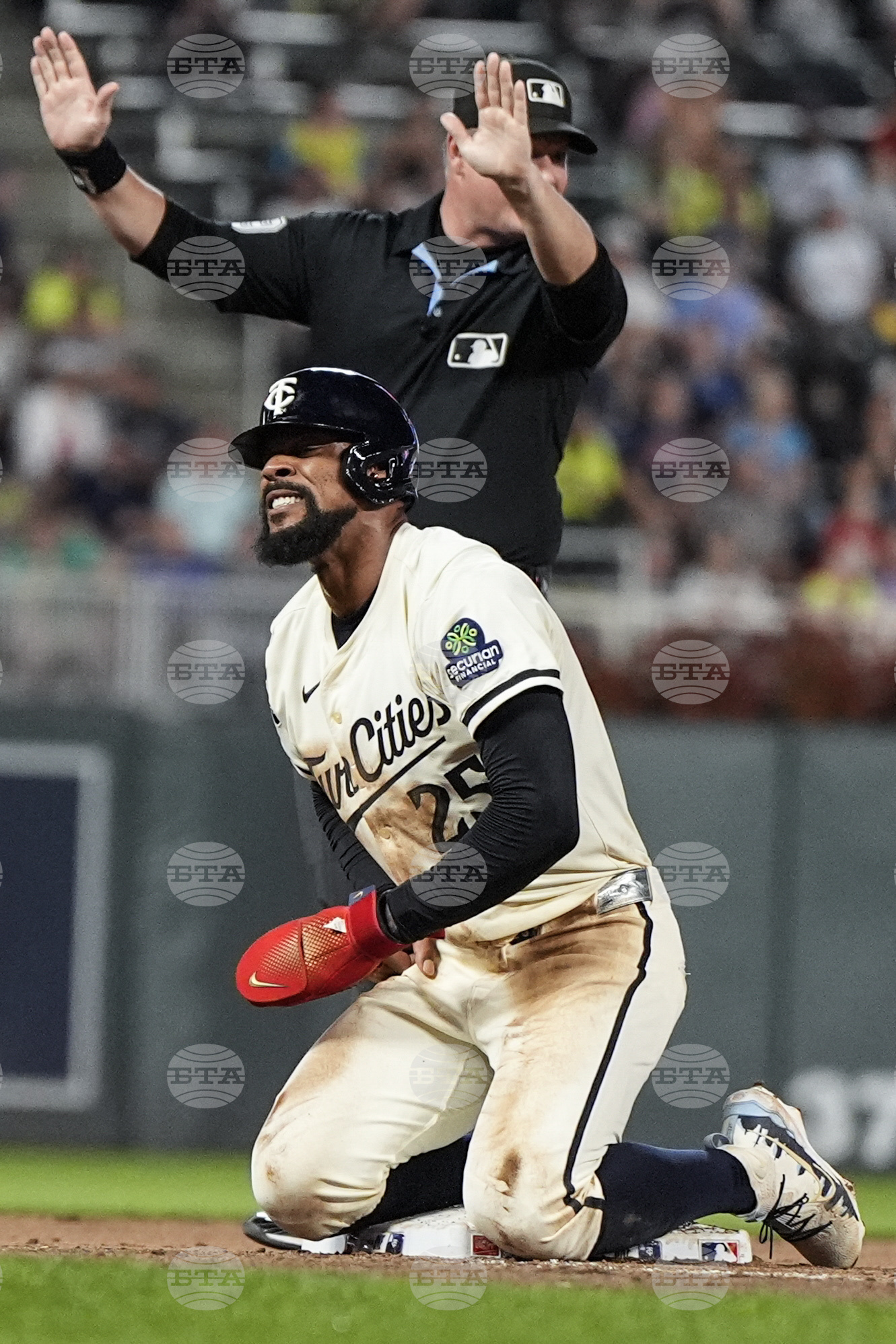 Minnesota Twins' Byron Buxton (25) reacts to an ijury while sliding to third base against the New York Yankees in the fifth inning of a baseball game, Tuesday, Sept. 16, 2025, in Minneapolis. (AP Photo/Mike Stewart)