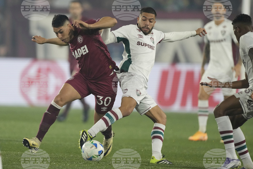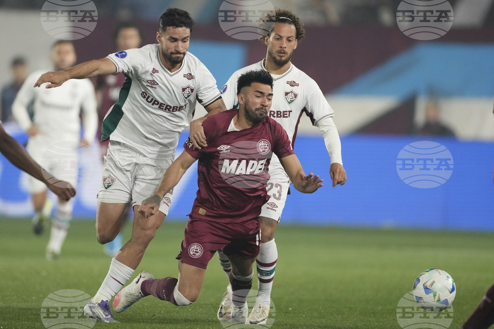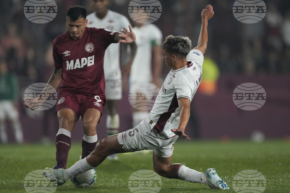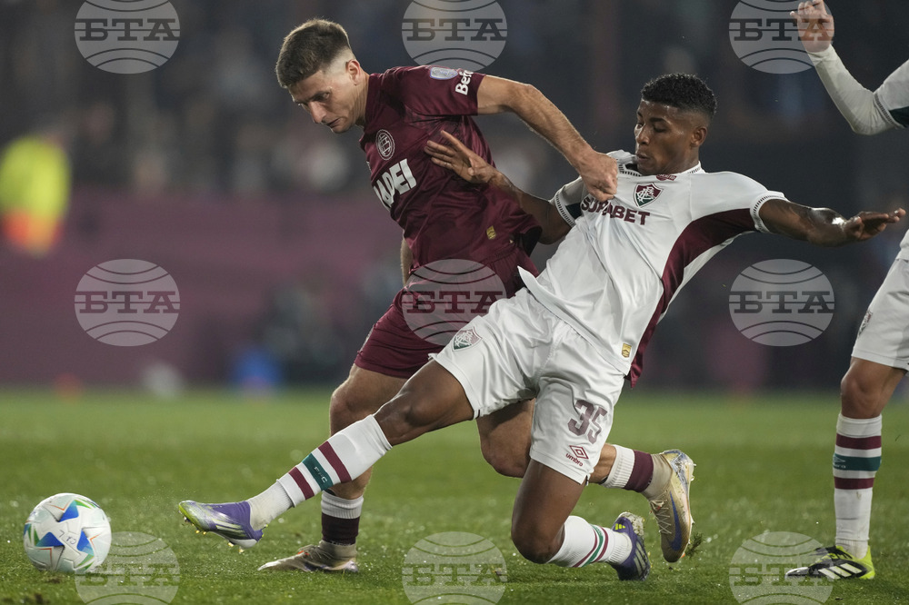 Walter Bou of Argentina's Lanus, left, and Facundo Bernal of Brazil's Fluminense battle for the ball during a Copa Sudamericana quarterfinal soccer match at Ciudad de Lanus stadium, in Buenos Aires, Argentina, Tuesday, Sept. 16, 2025. (AP Photo/Gustavo Garello)