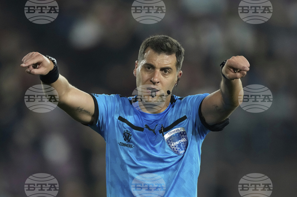 Referee Gustavo Tejera gestures during a Copa Sudamericana quarterfinal soccer match between Brazil's Fluminense and Argentina's Lanus at Ciudad de Lanus stadium, in Buenos Aires, Argentina, Tuesday, Sept. 16, 2025. (AP Photo/Gustavo Garello)