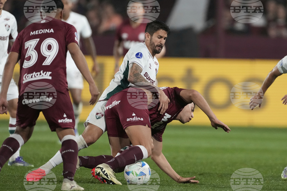 Agustin Cardozo of Argentina's Lanus, right, and Everaldo Stum of Brazil's Fluminense battle for the ball during a Copa Sudamericana quarterfinal soccer match at Ciudad de Lanus stadium, in Buenos Aires, Argentina, Tuesday, Sept. 16, 2025. (AP Photo/Gustavo Garello)