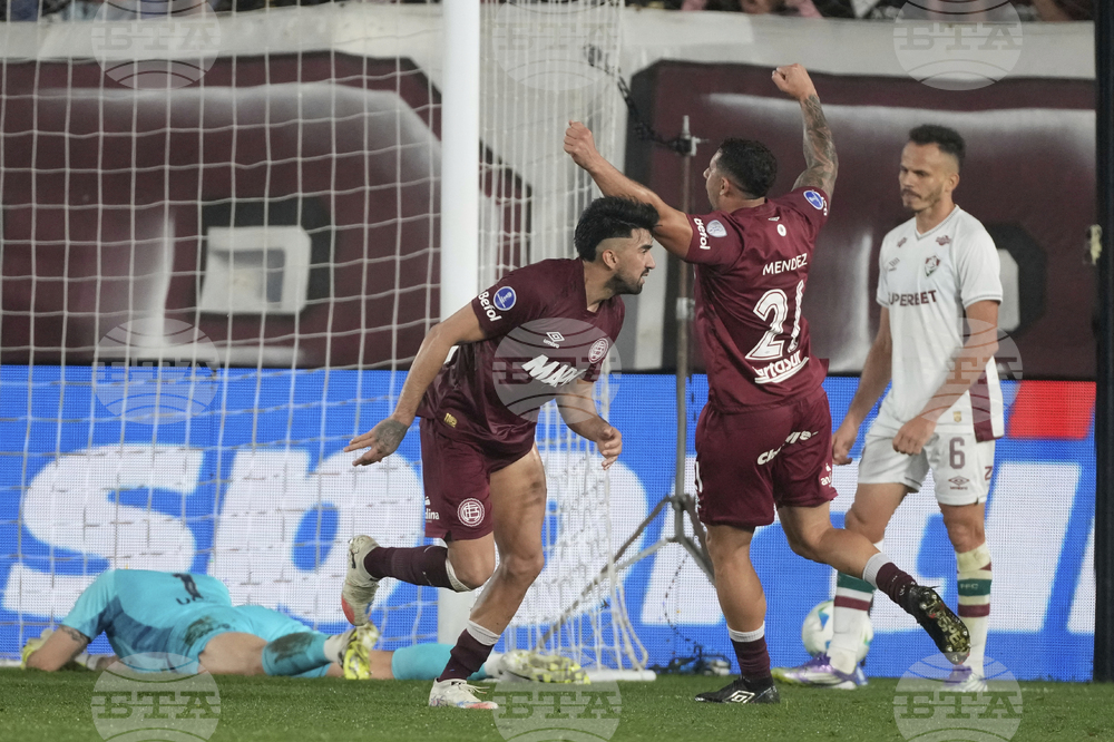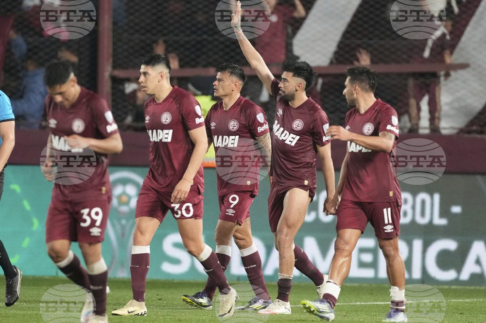 Players of Argentina's Lanus celebrate at the end of a Copa Sudamericana quarterfinal soccer match against Brazil's Fluminense at Ciudad de Lanus stadium, in Buenos Aires, Argentina, Tuesday, Sept. 16, 2025. (AP Photo/Gustavo Garello)